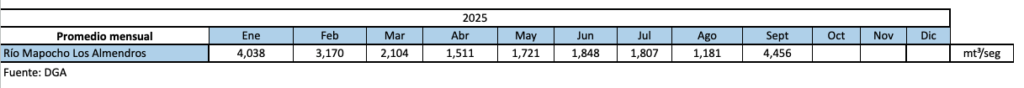 Nota: El Río Mapocho viene con un caudal mayor a lo correspondiente a derechos | Promedio = | 1.634 |