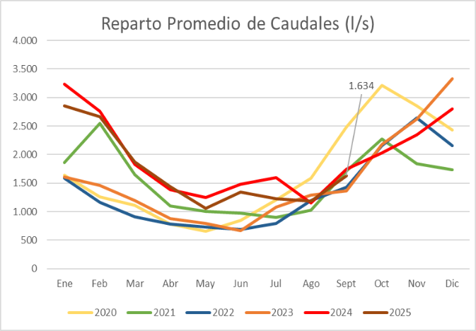 Fecha | VALORES EXTRAIDOS EN SEPTIEMBRE; AÑO 2025 (l/s) | Q Repartido | FR | ||||||