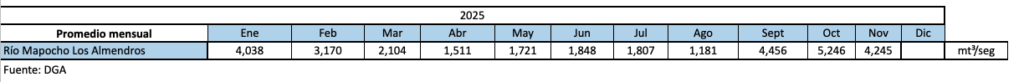| Nota: El Río Mapocho viene con un caudal mayor a lo correspondiente a derechos | Promedio = | 2.973 | |||||||